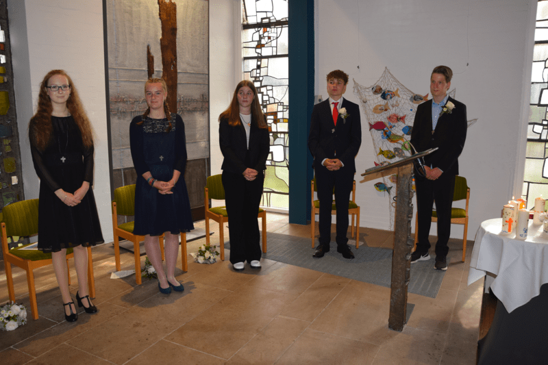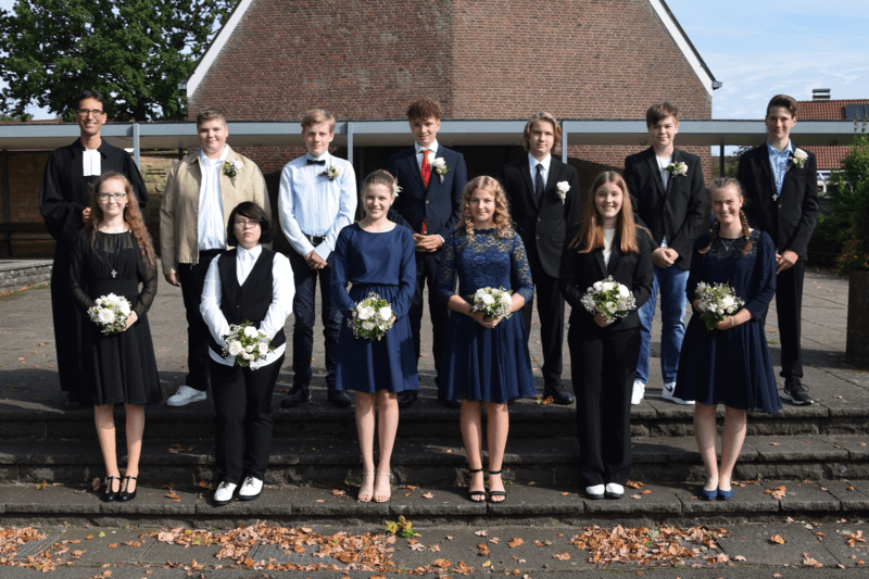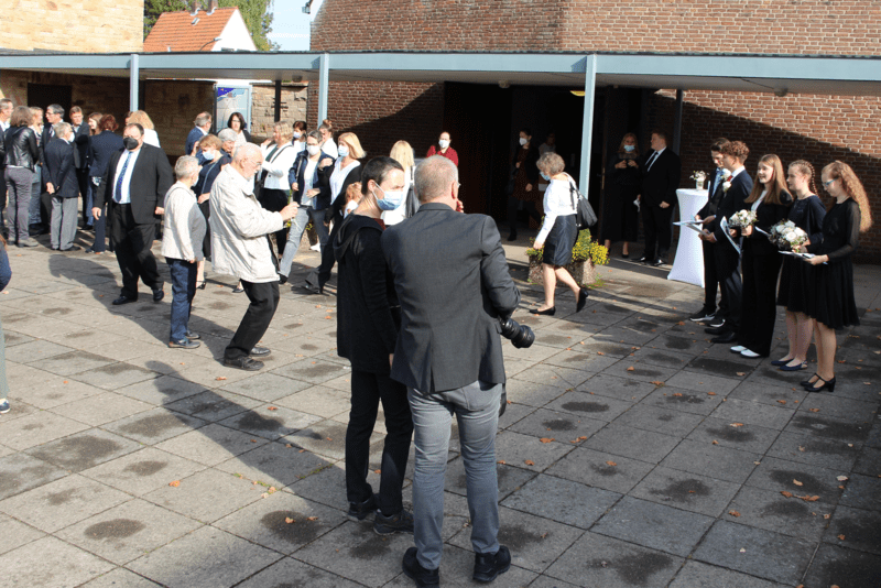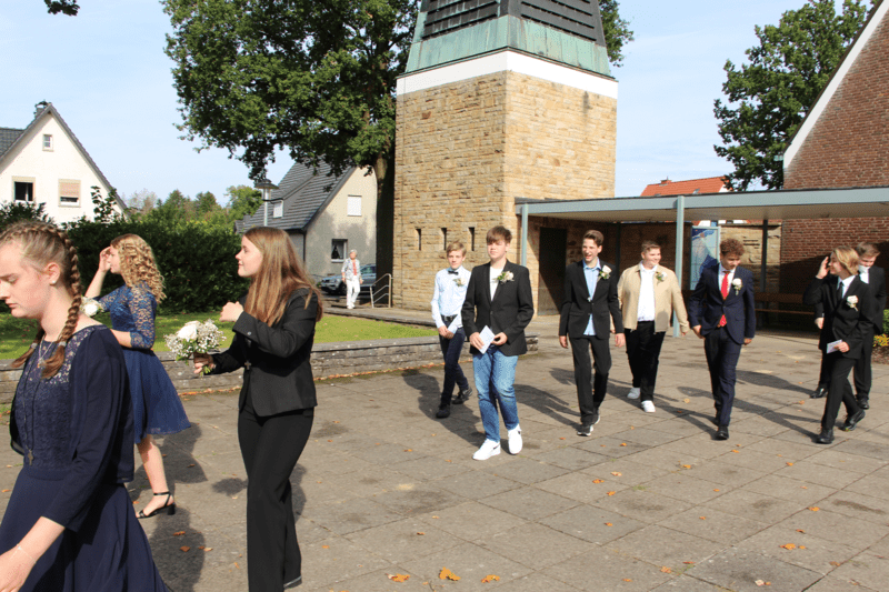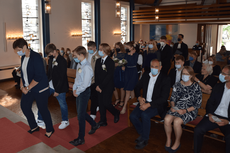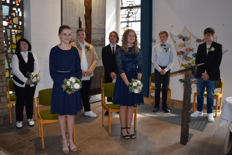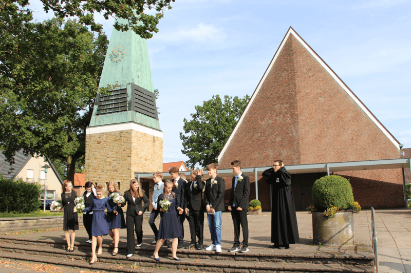 Zwischen den beiden Gottes-diensten war Zeit um Fotos aller 12 Konfirmanden gemeinsam mit Pastor Simon Kramer zu erstellen. Auch Fotos sind gute Erinnerungen an die Zeit des Konfirmations-unterrichtes, der für diese Gruppe häufig als Zoom-Veranstaltung im Homescooling stattfinden musste. Die Erinnerung an die Konfir-mandenzeit bleibt natürlich am lebendigsten, wenn die jungen Menschen der im Gottesdienst vorgetragenen Bitte des Kirchenvorstandes entsprechen und weiterhin aktiv am Gemeindeleben teilnehmen.