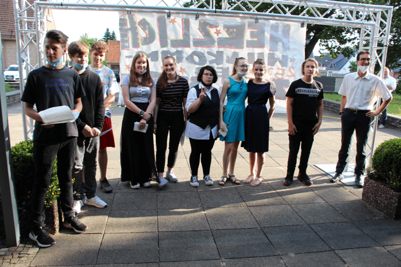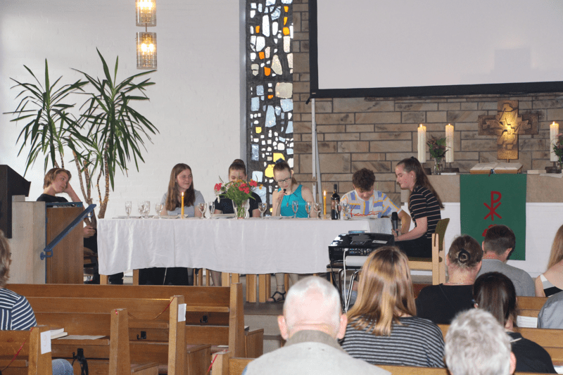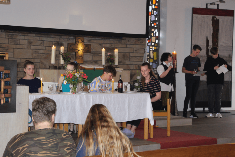 So feierten Sie stilecht einen Sektempfang (mit Mineral-wasser) und setzten sich an die festlich gedeckte Tafel im Altarraum. Da das Essen nicht allen mundete, wurde kurzerhand noch Pizza bestellt. Zum Schluss des Theaterstücks erinnerten sich alle an ihren Konfirmationsspruch und was er ihnen die Jahre über bedeutet hat.