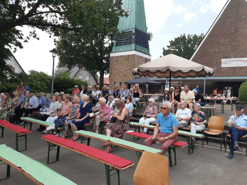 Das Gemeindefest am 24. Juni begann mit dem Aufbau. Den Bühnenwagen stellte die Gemeinde Belm auf. Der Aufbau der Würstchenbude, den Sonnenschirm in der Mitte des Platzes vor der Kirche, die Tische und Bänke, der Altar auf dem Bühnenwagen, das Verlegen der Stromkabel für die verschiedenen Geräte, alles war die Arbeit von vielen Ehrenamtlichen. Das gilt auch für die Cafeteria, die Gestaltung der Spielwiese für die Kinder, die Organisation auf dem Getränkewagen und so weiter… Kirche lebt vom Ehrenamt, auch die Musik. Der Posaunenchor, der die Lieder im Gottesdienst begleitete, war leider nur in kleiner Besetzung dabei.