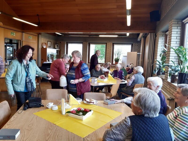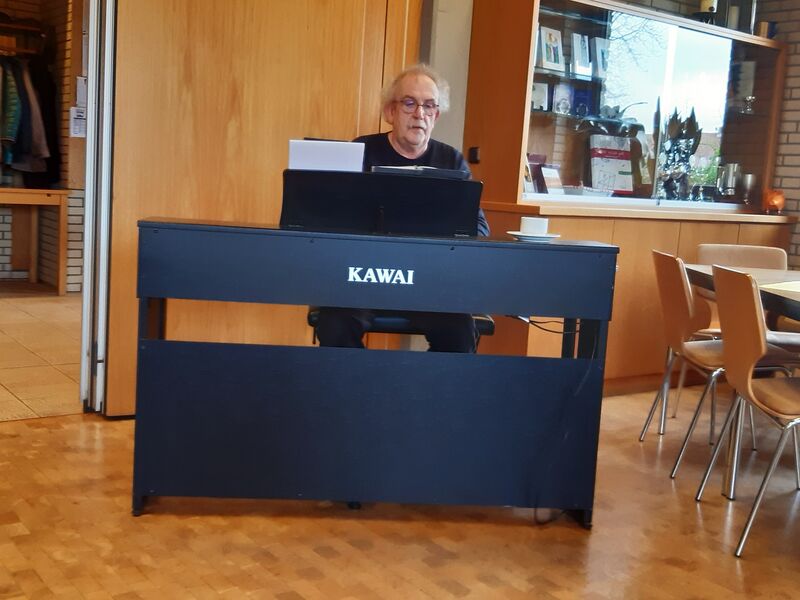 Beim Kaffee- und Teetrinken gab wieder Zeit zum Gespräch an den Tischen. Die Kuchenplatten wurden dabei weitgehend leer. Das Küchenteam hatte wieder gute Arbeit geleistet. Dann war es an Michael Schmoll, Lieder vorzuschlagen und am elektrischen Klavier zu begleiten. Er hatte sich für eine alphabetische Reihenfolge aus dem Gotteslob entschieden und dabei auf die Markierung (ö) für Ökumenisch geachtet. Also kannten die Christen aus der katholischen wie der evangelischen Kirchengemeinde die meisten Lieder und sangen kräftig mit. Michael Schmoll erzählte zu den Liedern historisches und aktuelles, so dass die Senioren auch Neues zu den Liedern erfahren konnten.