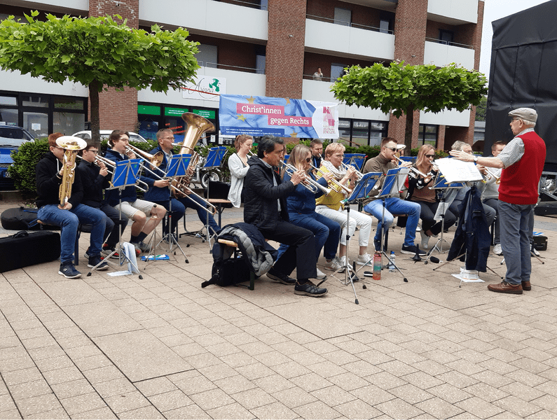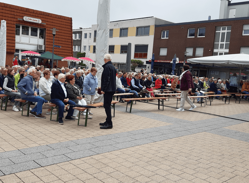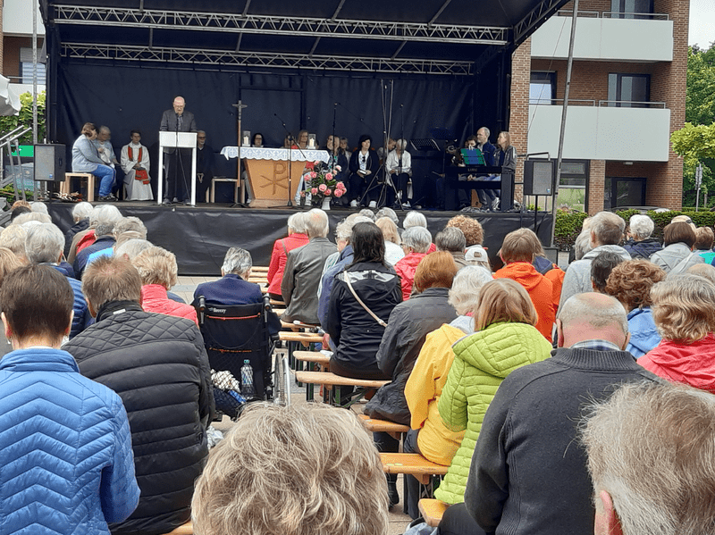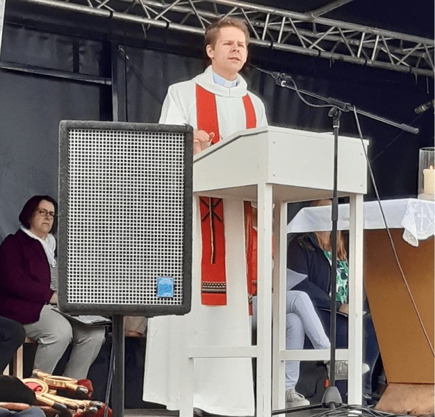Beim 16. ökumenischen Pfingstmontagsgottes-dienst 2024 auf dem Belmer Marktplatz hielt Pastor Peter