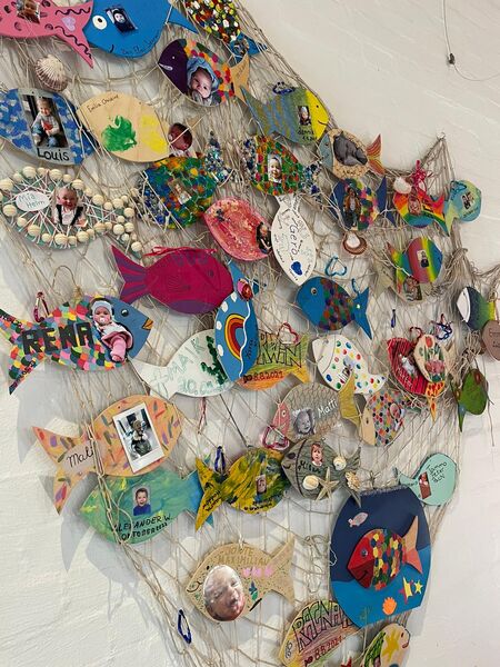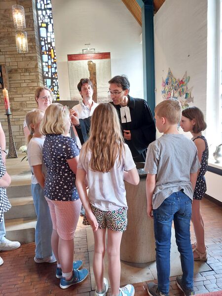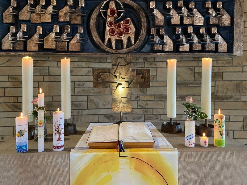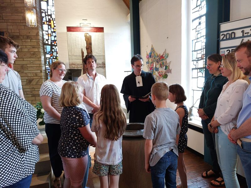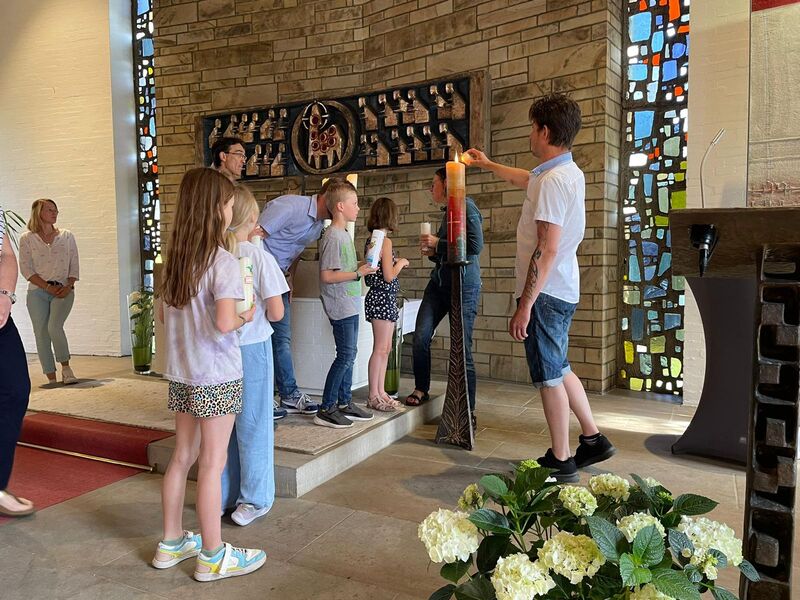 Beim Familiengottesdienst am 26. Mai 2024 waren die Familien eingeladen worden, deren Kinder in den Jahren 2014-2016 in unserer Johanneskirche getauft waren. 6 Familien mit ihren Kindern und Paten waren gekommen. Im Rahmen der Begrüßung bat Pastor Simon Kramer die Kinder, ihre mitgebrachten Taufkerzen an der Osterkerze anzuzünden und auf dem Altar abzustellen. Nach der Predigt, in der es um Wasser und die Bedeutung der Taufe ging, erhielten die Kinder mit dem Wasser aus dem Taufbecken ein Kreuz auf die Stirn. Dies ist ein Zeichen, dass sie zur Kirche Jesu Christi gehören und sich ihrer Taufe bewusst werden. Auch die Paten, Eltern und weiteren Gottesdienstbesucher erhielten das Kreuzzeichen mit Wasser auf der Stirn oder auf die Handfläche. Als Verbindung der Tauferinnerung mit den Fischfiguren im „Taufnetz“ konnten alle ein Herz an das Netz befestigen und nach dem Gottesdienst mitnehmen. Lieder zur Taufe und zur Segnung ergänzten den Gottesdienst.