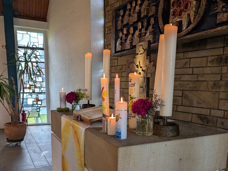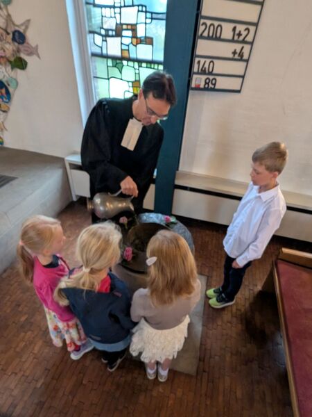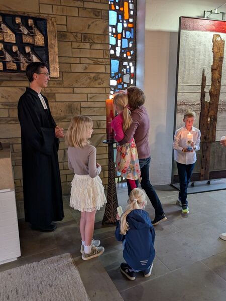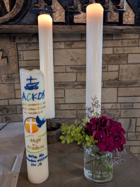 Am Sonntag Trinitatis hatte die Johanneskirchengemeinde zum Familiengottesdienst mit Tauferinnerung eingeladen. Auch wurde ein kleines Kind getauft und damit in die Gemeinde aufgenommen. Vier Kinder hatten ihre Taufkerzen mitgebracht. Beim Eingießen des Taufwassers in das Taufbecken durften die Kinder zuschauen und das Wasser fühlen. Nach der Taufe wurden auch die vier Taufkerzen angezündet und die Kinder stellten sie auf den Altar. Dort brannte schon die Friedenskerze der Arbeitsgemeinschaft Christlicher Kirchen in Osnabrück (ACKOS). Die Kerze wird im Verlauf eines Jahres durch alle christlichen Kirchengemeinden in Osnabrück wandern und im Gottesdienst als Zeichen für Frieden und Gerechtigkeit Licht und Hoffnung spenden. In der Predigt nahm Pastor Simon Kramer auf das Licht und die Wärme der Kerze Bezug und wünschte den Kindern und der Gemeinde, dass das Licht des Glaubens immer brennt.