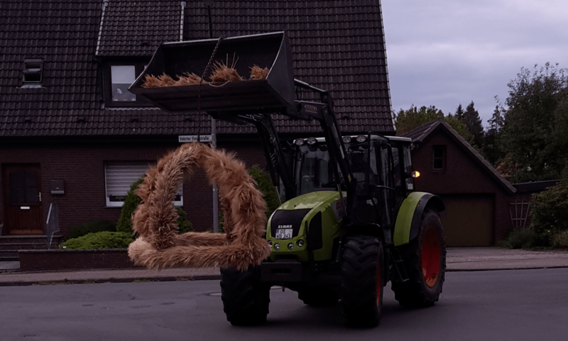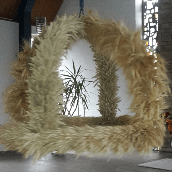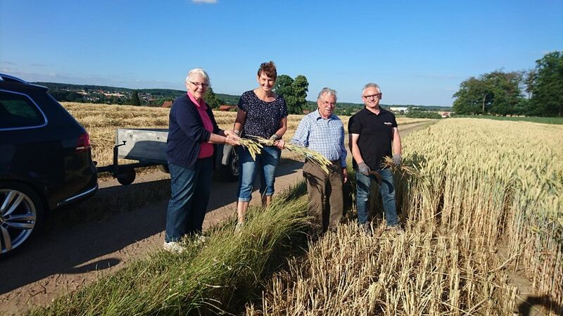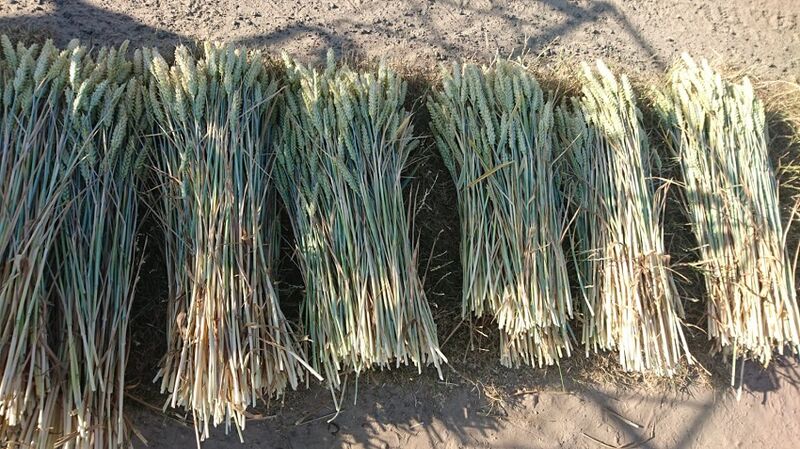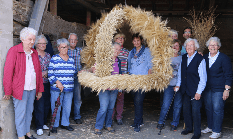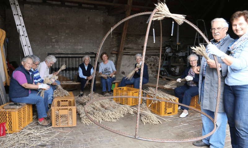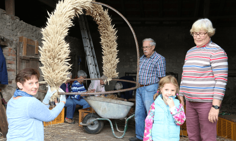Die Erntekrone wird dieses Jahr neu gebunden. Das Getreide dafür muß gemäht werden, bevor Mähdrescher auf die Felder fahren. Anfang Juli sind Doris, Karin, Helmut und Andreas aktiv geworden und haben verschiedene Getreidesorten gemäht und zum Trocknen gelagert. Bald kann die Krone neu gebunden werden.